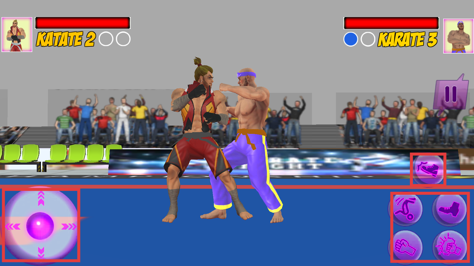 2、格斗时操控左侧【虚拟摇杆】移动,点击右侧【技能-按钮】打出连招,留意【KARATE-2】与对手的血条变化,灵活调整攻防。