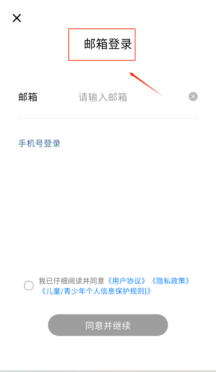 1、打开APP进入登录页,顶部显示"邮箱登录"选项,输入框提示"请输入邮箱",右侧有清空按钮呀。下方蓝色文字可切换手机号登录哦。