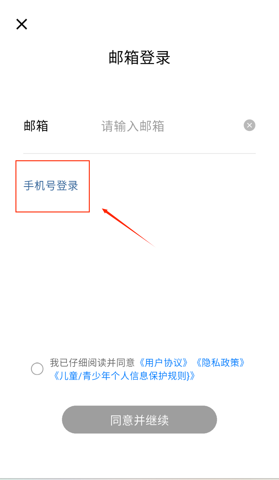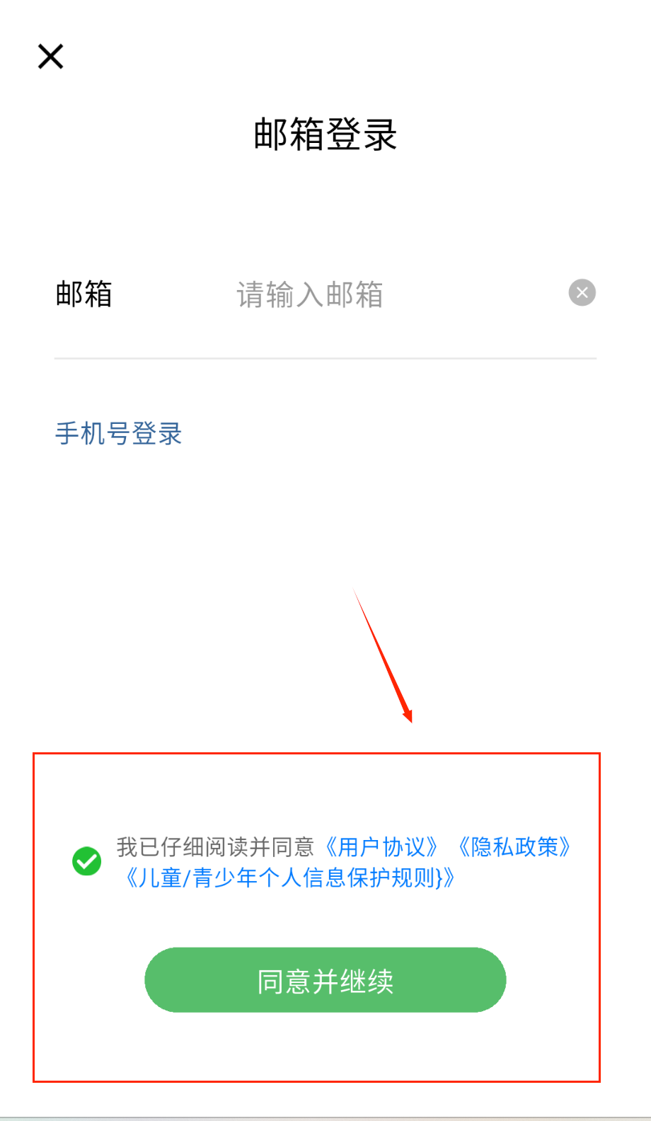 3、两种登录方式都需勾选同意协议,协议内容包含用户条款和隐私政策呀。勾选后点击蓝色"同意并继续"按钮完成登录哦。