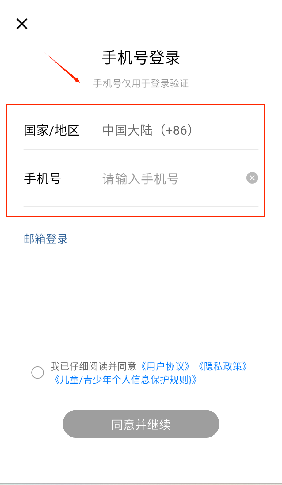2、手机号登录页默认中国大陆 86区号,输入框提示"请输入手机号",上方注明号码仅用于验证呀。邮箱登录选项在页面底部啦。