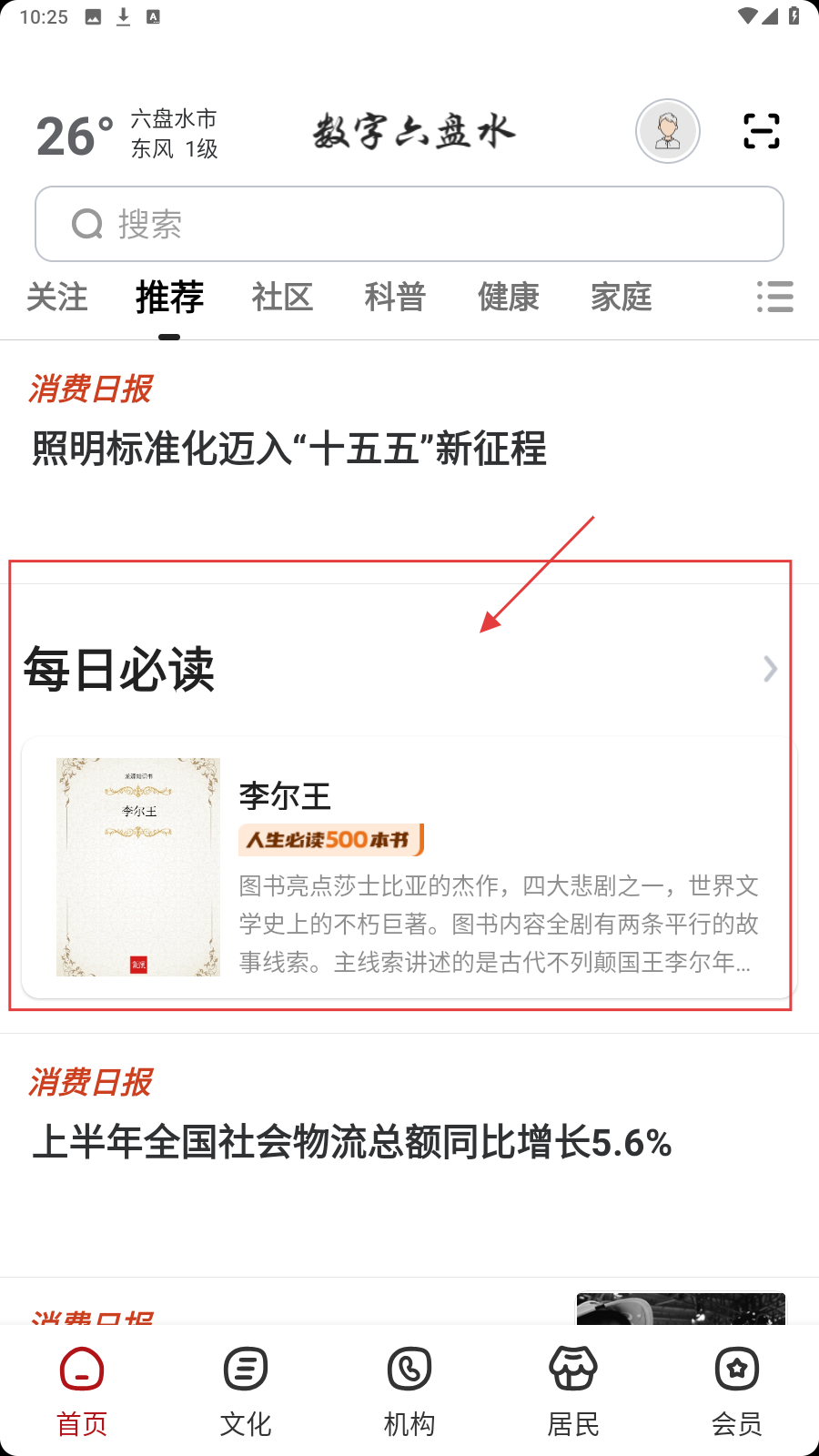 1、打开应用,在【首页】推荐中,查看【每日必读】栏目,点击书籍。