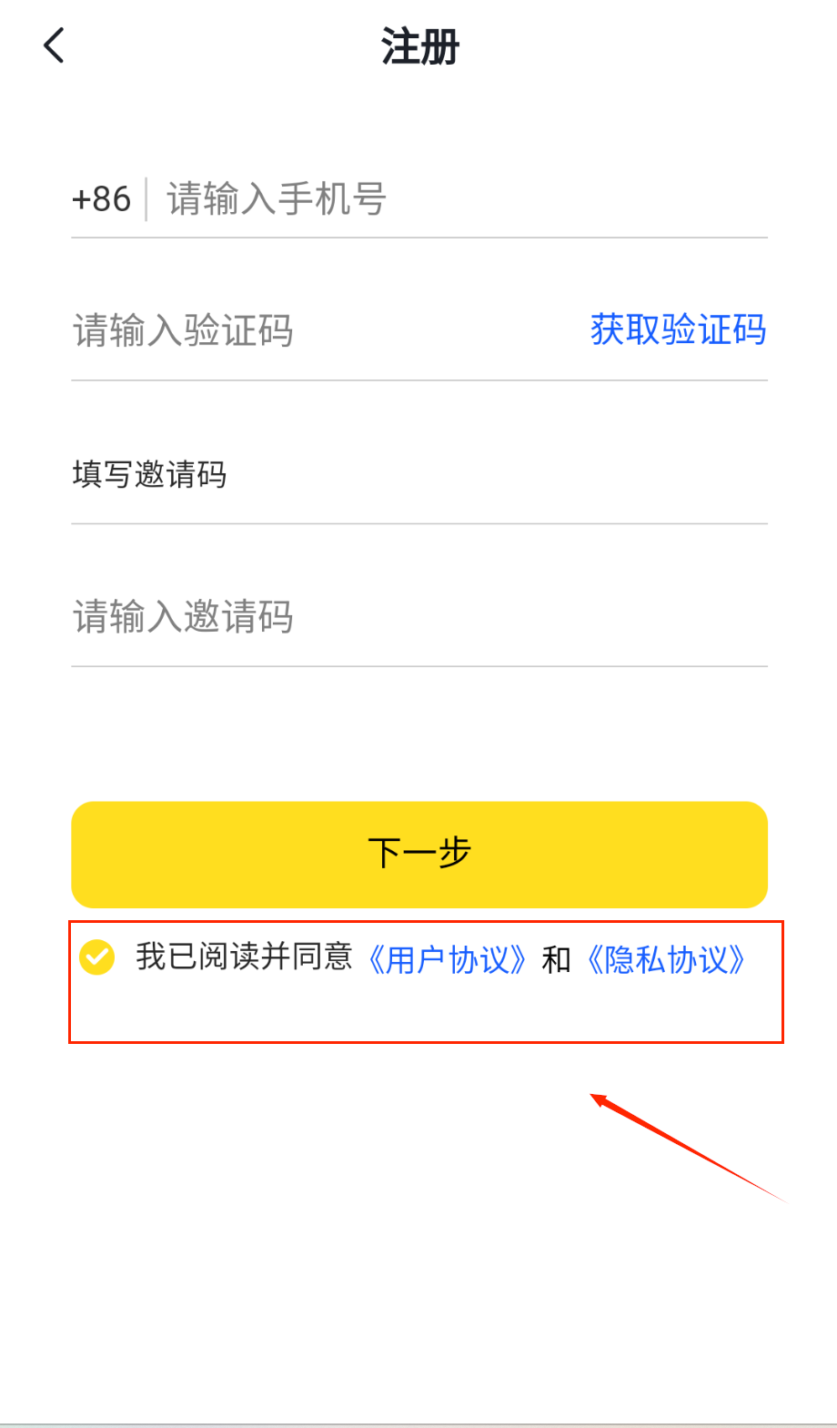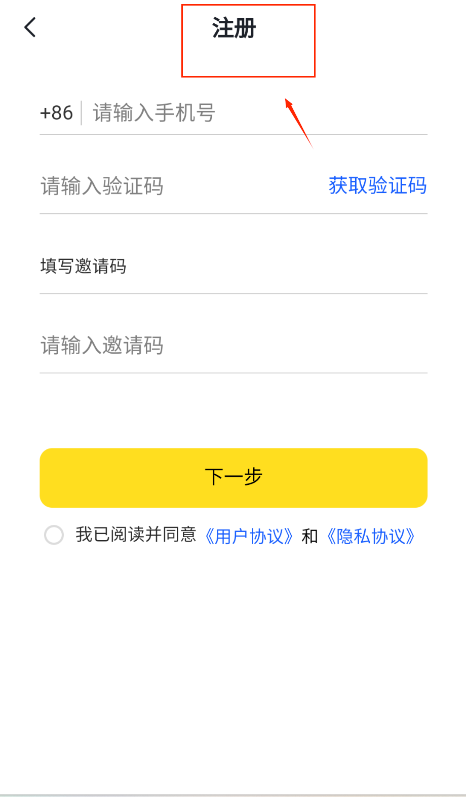 1、打开APP进入注册页,顶部显示"注册"标题,依次填写手机号、验证码和邀请码呀。验证码点击蓝色"获取验证码"按钮,短信收到后填入哦。