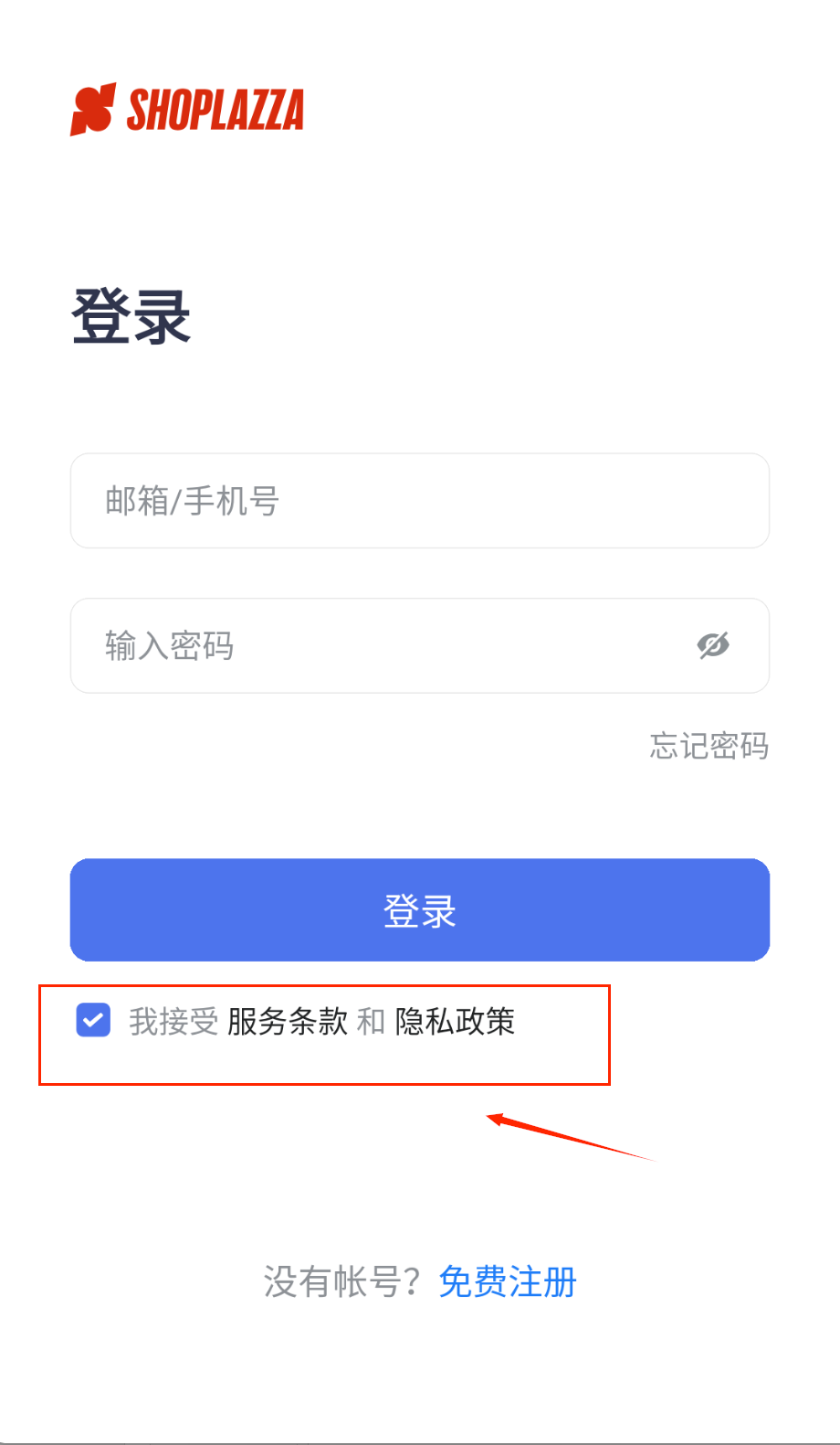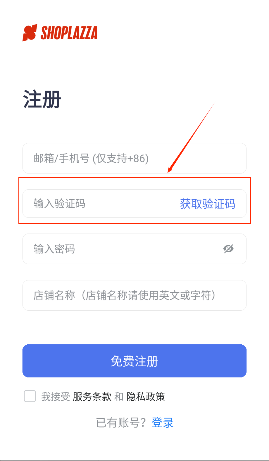 1、打开APP进入注册页,顶部红色SHOPLAZZA标志醒目,输入框提示"邮箱/手机号(仅支持 86)"呀。密码框右侧眼睛图标可切换显示哦。