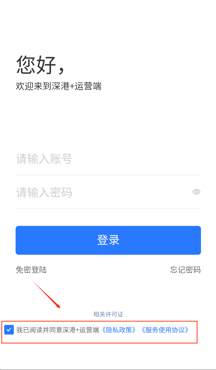 1、打开APP进入登录页,顶部显示"您好,欢迎来到深港 运营端"问候语,下方是账号密码输入框呀。密码框右侧眼睛图标可切换显示哦。