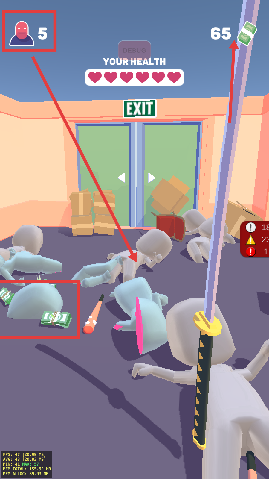 2、击败敌人后拾取地面钱币,关注【YOUR-HEALTH】状态,积累资源同时维持角色生存能力。