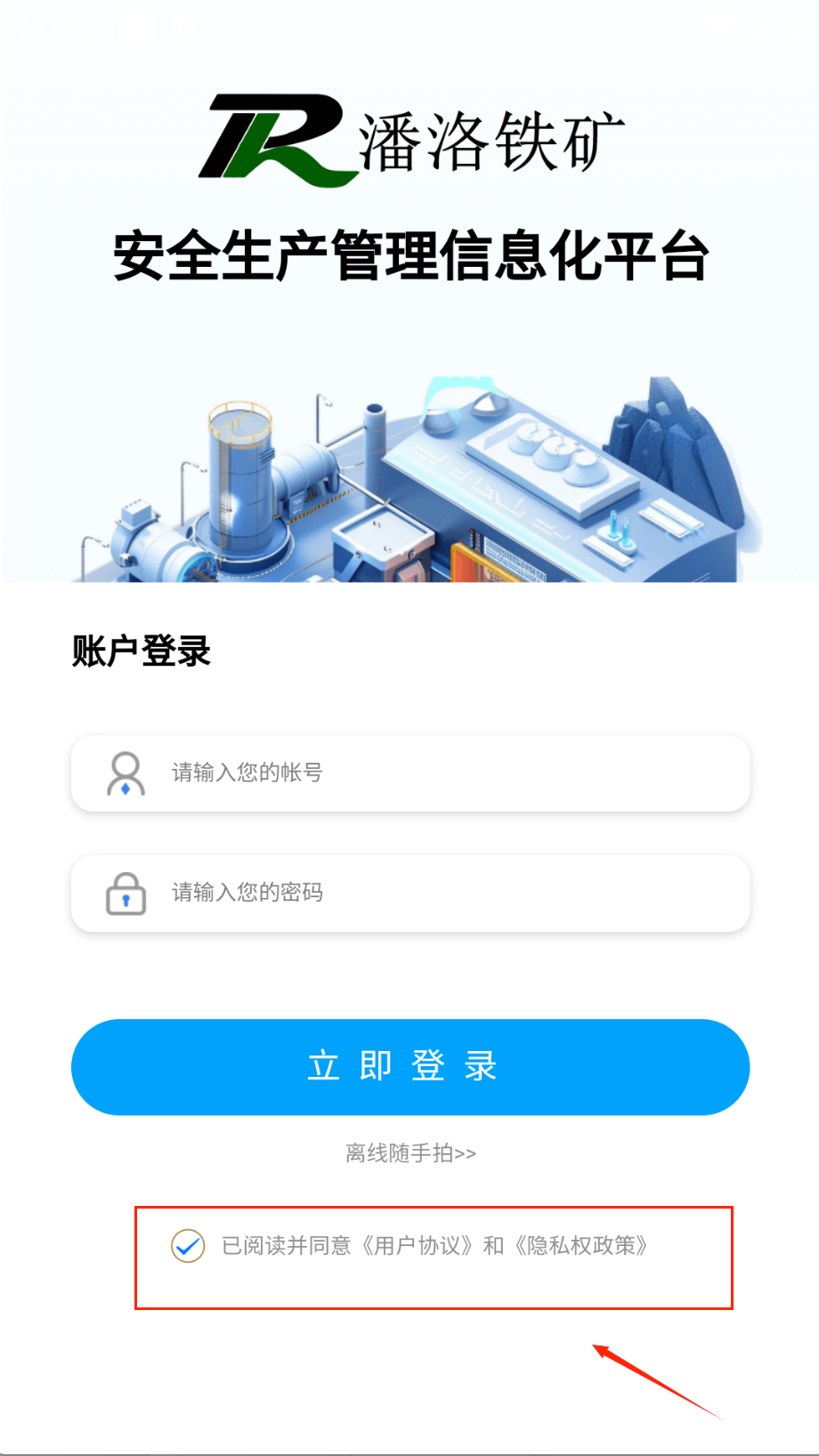 1、打开APP进入登录页,蓝白工业风界面简洁明了,输入框提示"请输入您的帐号"和"请输入您的密码"呀。密码输入时注意大小写哦。