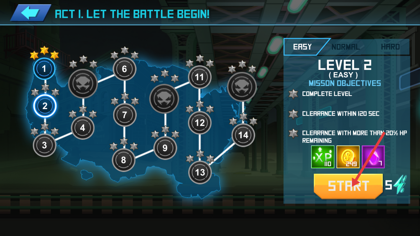 1、在【ACT-I-LET-THE-BATTLE-BEGIN!】界面选【LEVEL-2-(EASY)】,确认任务后点【START】开启战斗。