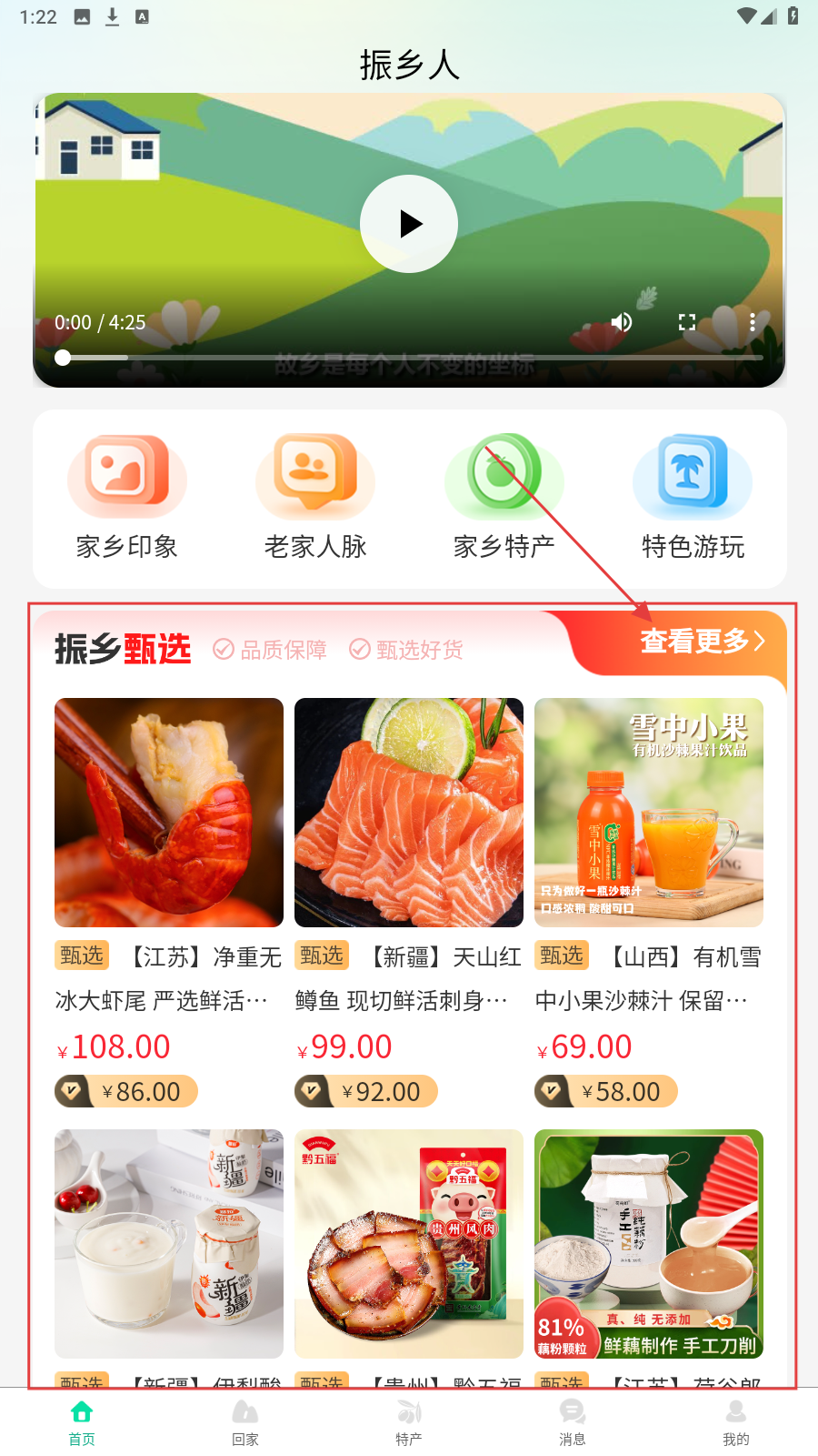 1、首页点【振乡甄选-查看更多】,进入商品列表选心仪特产。
