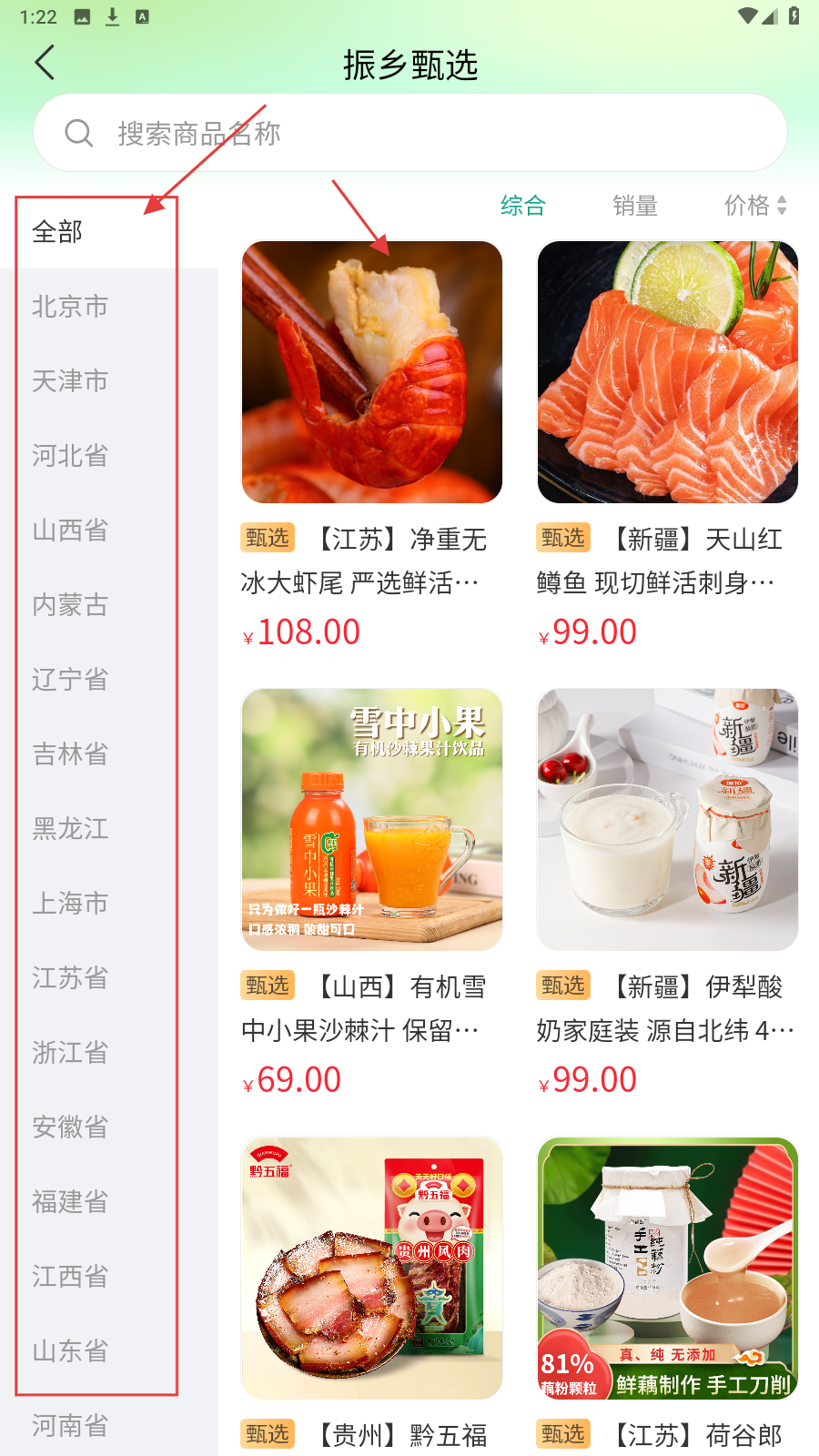 2、左侧选地区(如江苏省),筛选对应家乡特产商品精准找货。