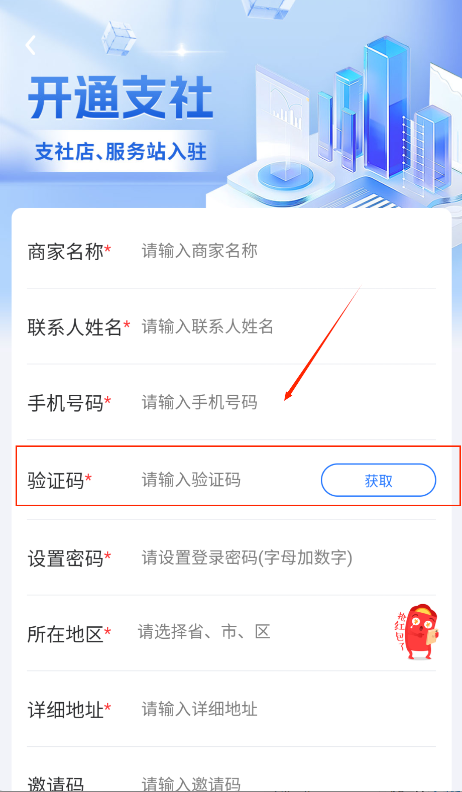 1、打开APP进入登录页,点击"注册账号"进入开通支社页面,填写商家名称、联系人等必填信息呀。带星号字段都要如实填写哦。