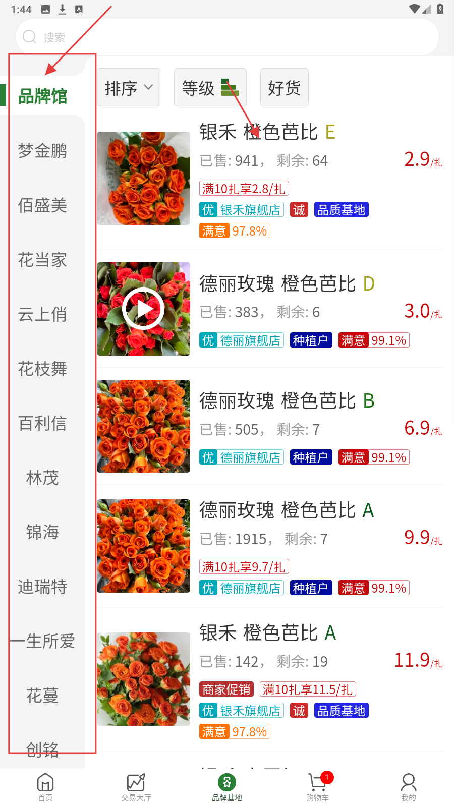 2、在品牌馆商品列表,选目标鲜花(如橙色芭比)查看详情。