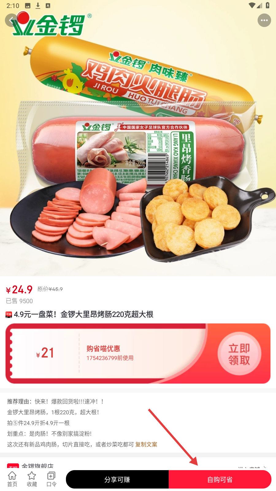 3、看到目标商品(如金锣里昂烤肠),点进商品详情页。