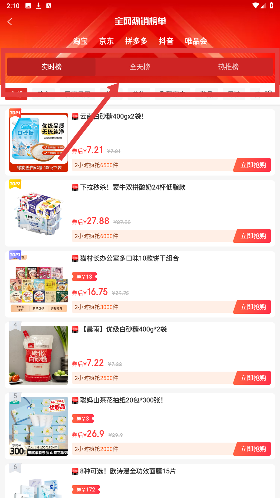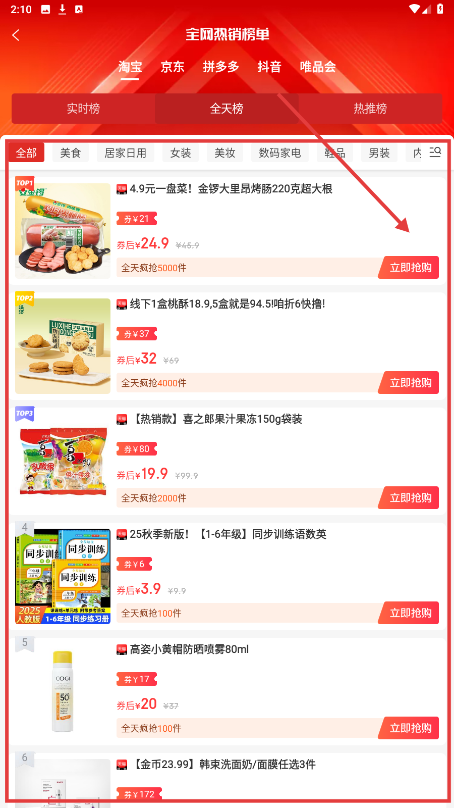 2、在榜单页切换到【全天榜】,浏览各品类商品找想购的。