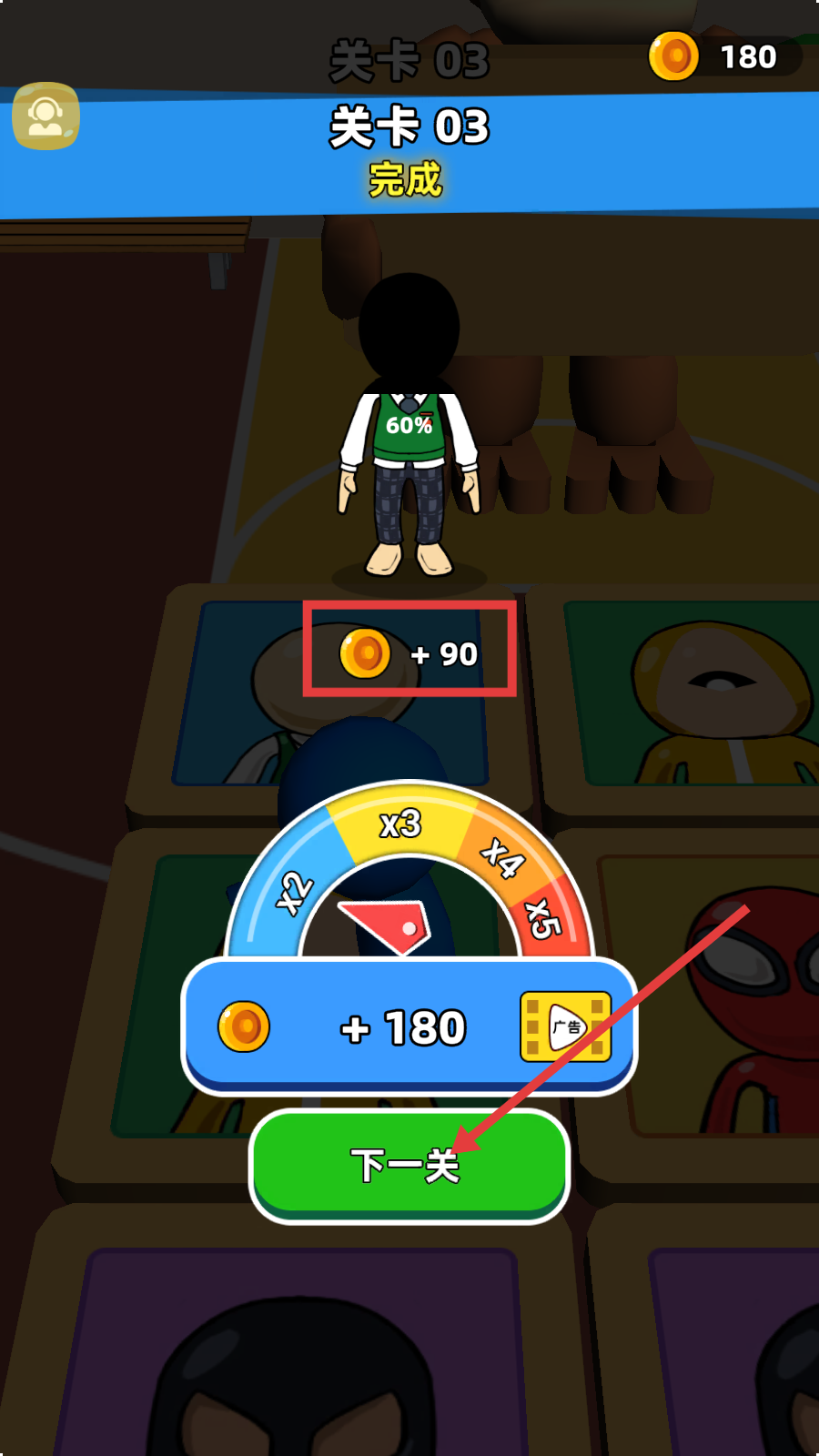 4、完成【关卡03】后获【金币 90】奖励,点击【绿色-下一关】按钮即可挑战后续关卡。