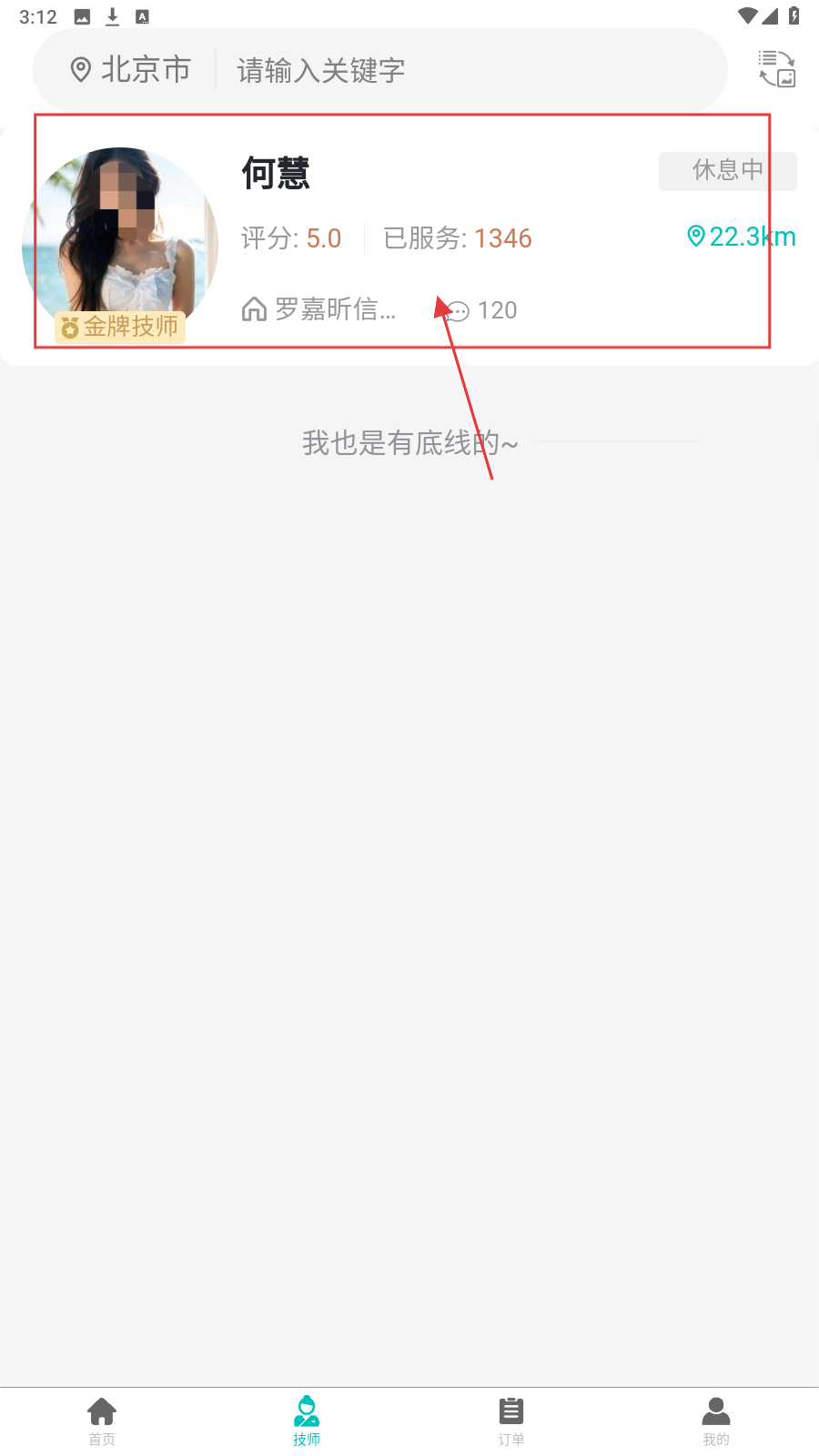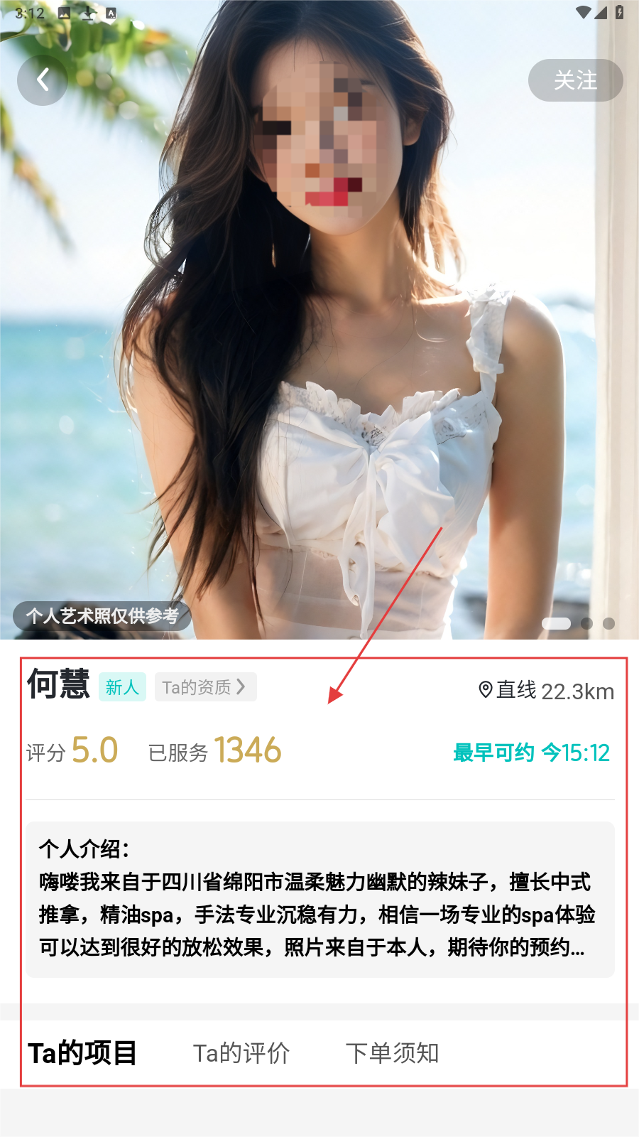 4、进入技师个人页,看评分-服务次数-擅长项目,确定后预约服务。