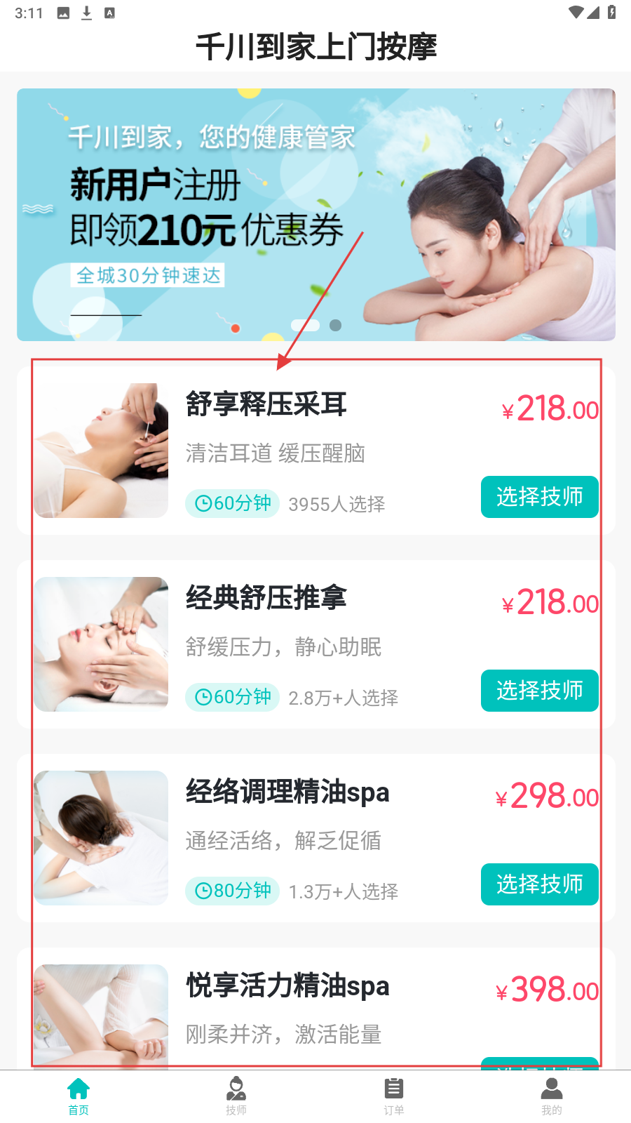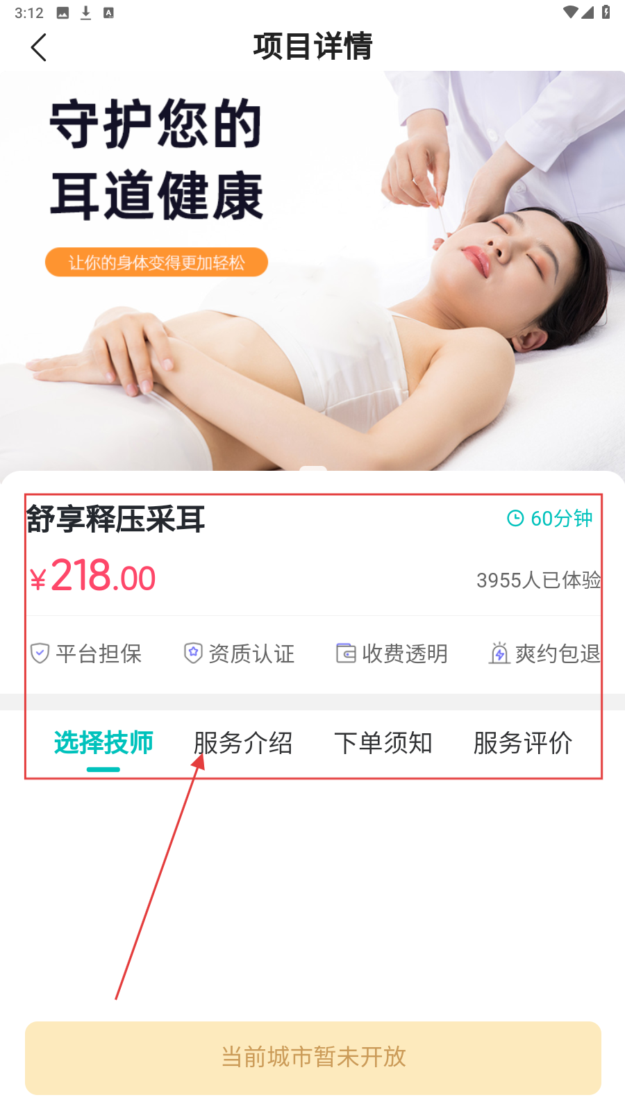 1、打开首页,选心仪按摩项目,如【舒享释压采耳】,点进入详情。