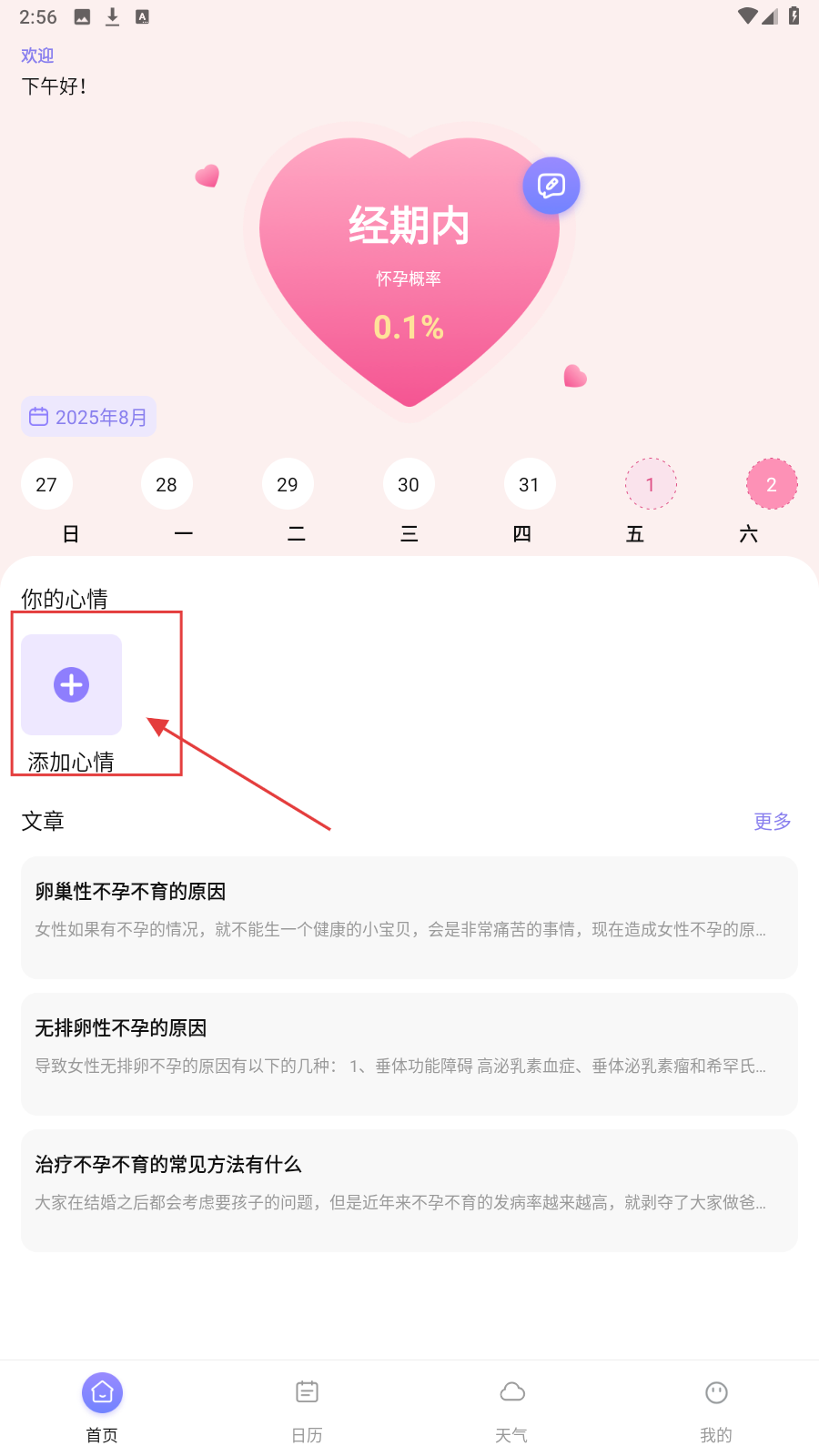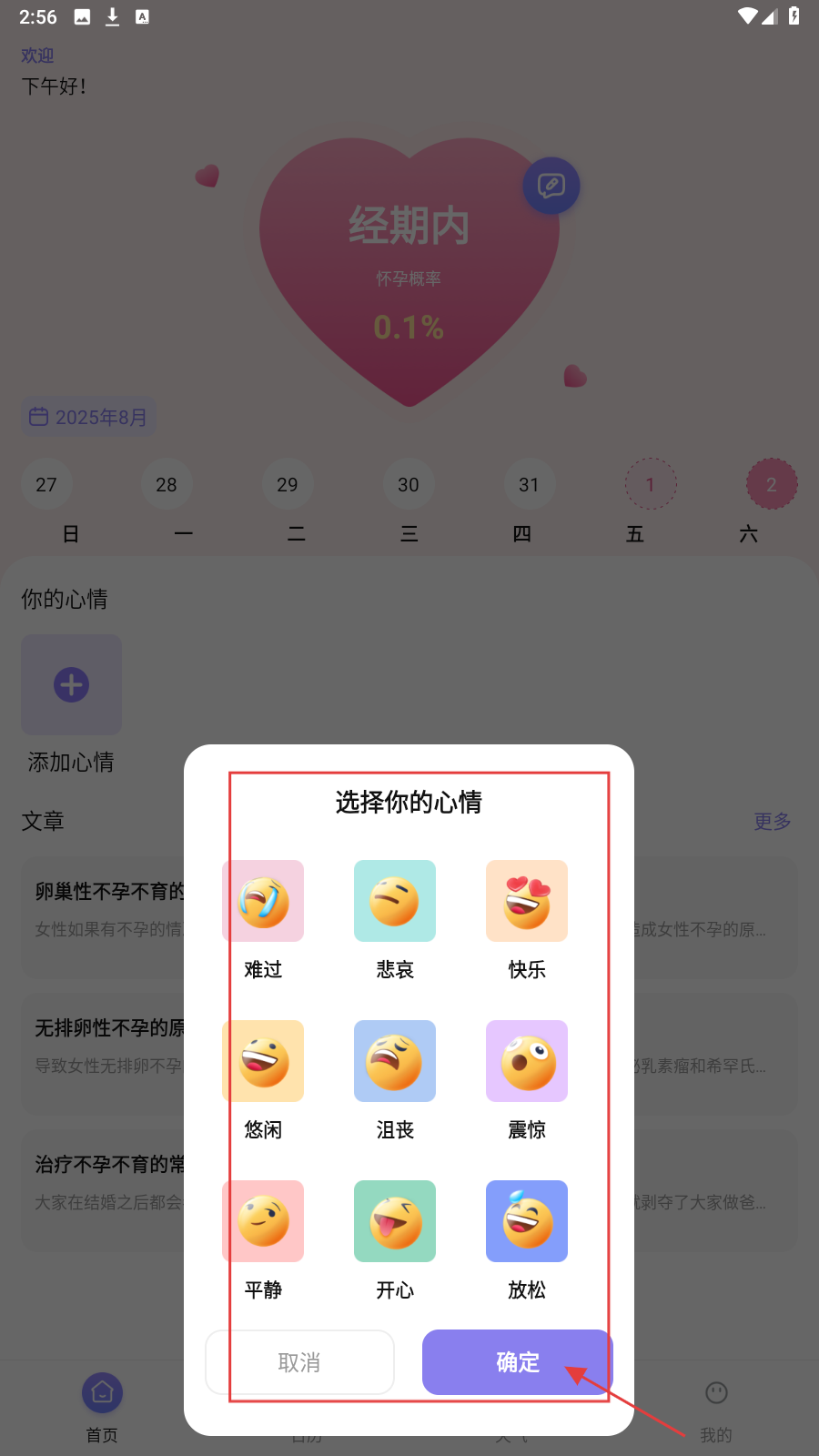 1、在首页点【添加心情】,选对应心情表情,点确定记录当日心情。