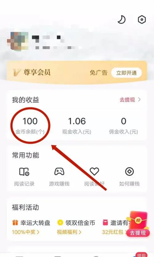 3、进入我的页面后点击我的收益项里面的“金币余额”