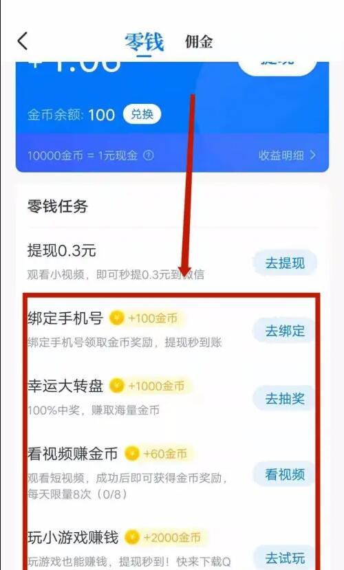 4、页面跳转进入“零钱”页面,在下面点击有金币提示的项去完成