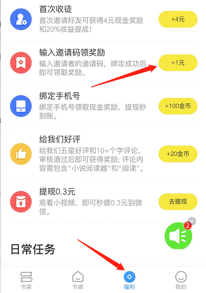1、进入到首页中,点击下面的“福利”按钮,在滑动页面,找到输入邀请码的位置,如下图所示!