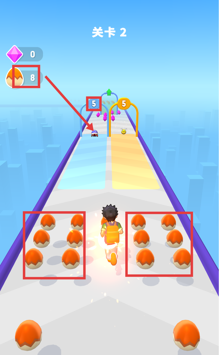 1、在【关卡2】起始阶段,依据下方滑动提示操作角色,优先收集路径上的蛋,为后续积累资源。
