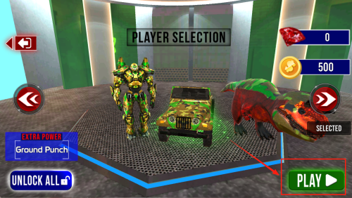 2、选择角色:在“PLAYER SELECTION”界面点击“SELECTED”确认角色,再点“PLAY”继续。