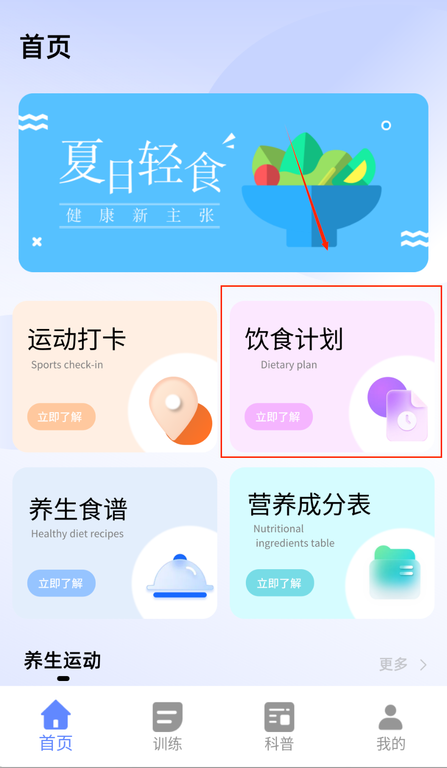 3、饮食计划模块可查看推荐菜谱与食材搭配,自定义餐单支持手动调整热量摄入,扫码识别功能快速获取包装食品营养信息。