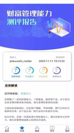 2、选择测评个人财富管理能力更加随意自由,测试报告非常清晰,查看更方便。