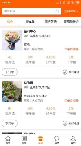 3、用户在软件中能够看到各个花店的信用值、接单量、好评度和下单量信息操作。