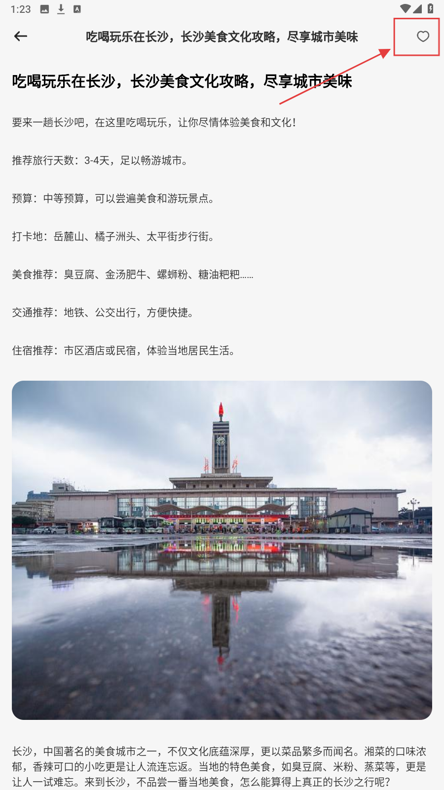3、打开攻略详情,浏览行程推荐,点右上角【爱心】收藏心仪内容。