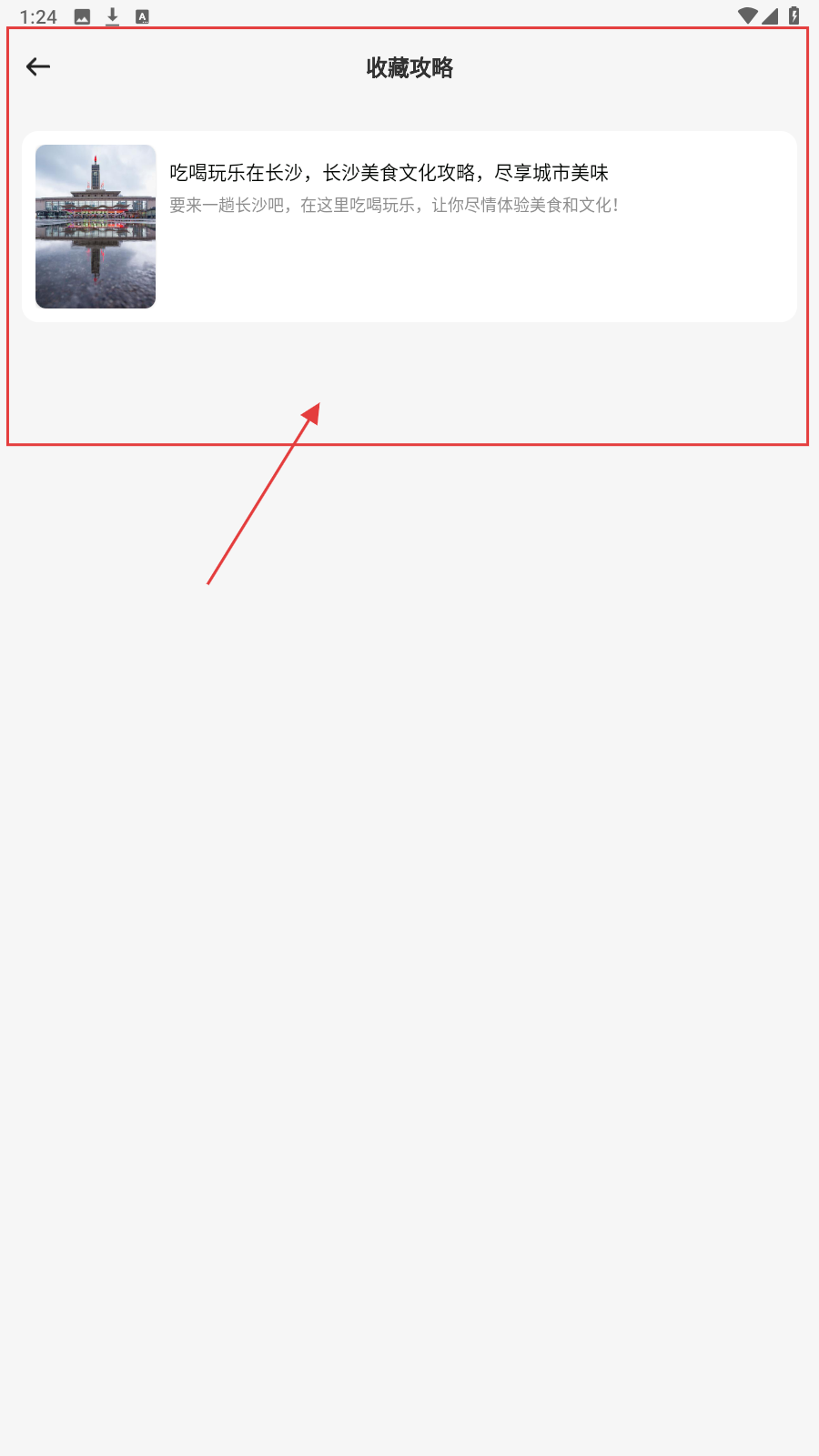 4、切换至【收藏攻略】页,查看已存内容(如长沙攻略),随时回顾规划。