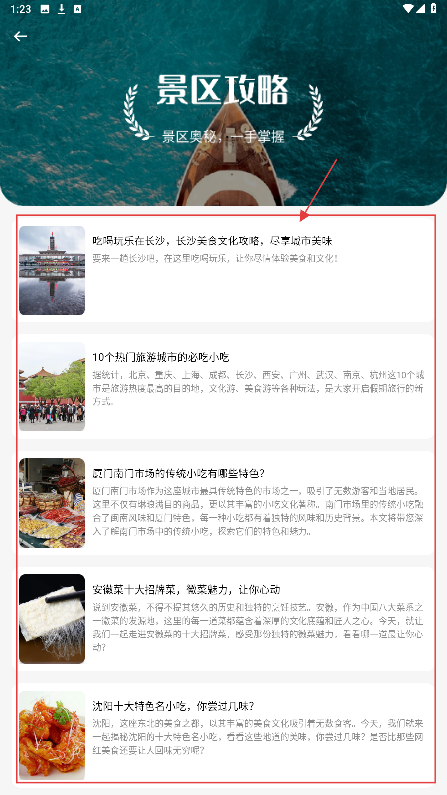 2、点击【景区攻略】,选择感兴趣主题(如长沙美食),查看详细玩法。