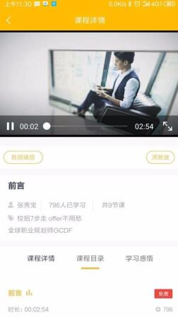 2、展示多种课程详情内容栏目,每个课程详情中都划分了课程详情、目录以及学习感悟栏为你服务。
