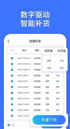 1、一键批量补货,让补货变得更专业,提高补货的准确度,提高商品管理的效率,给你更好的营销体验。