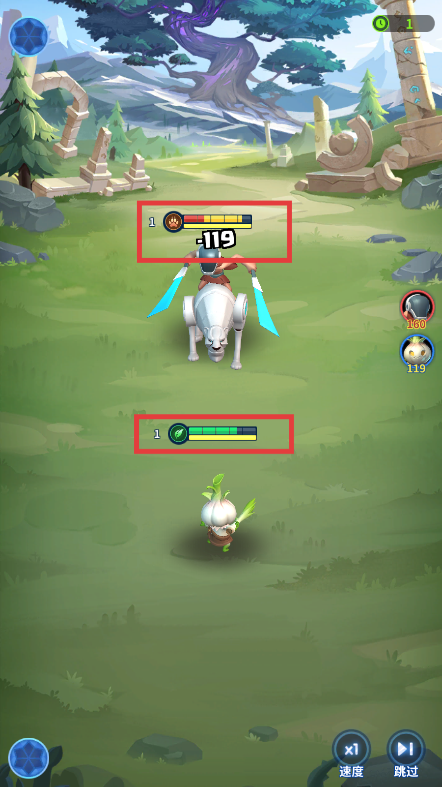 3、战斗中关注血条变化,让蒜头武士打出【-119】伤害,持续攻击敌方,全力争取胜利。