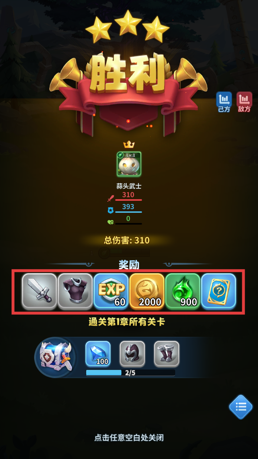 4、胜利后领取武器、衣服等奖励,获取【EXP-60】【金币-2000】等资源,用于角色与装备强化。