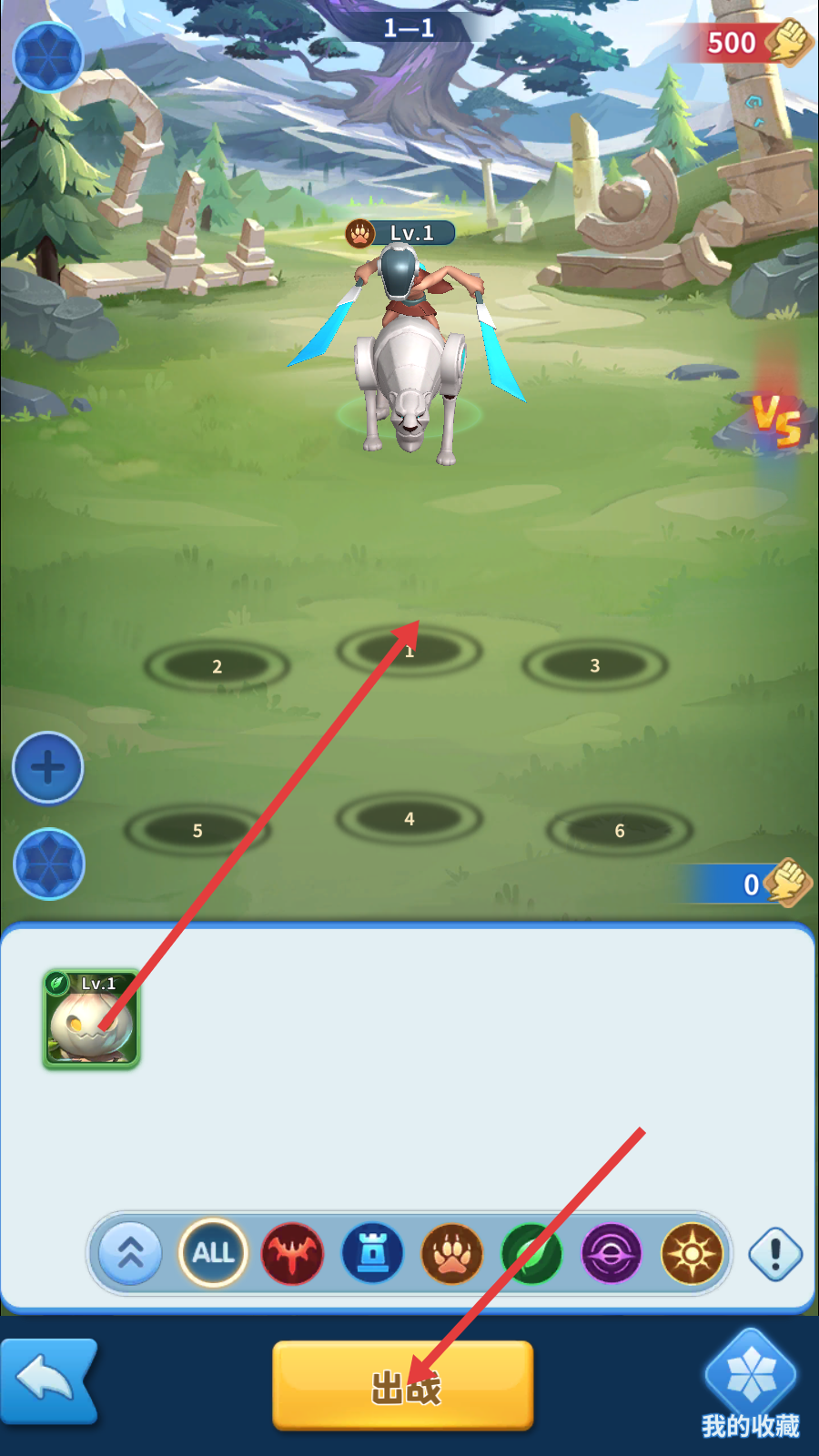 2、在战斗准备界面,将Lv.1角色放入格子,点击【出战】,于【1-1】关卡开启战斗征程。