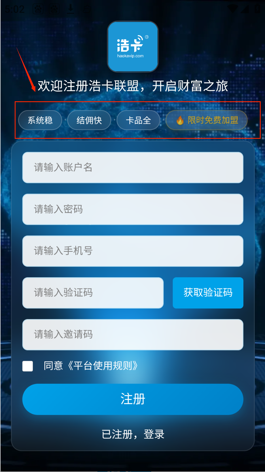 1、打开软件就能看到清爽的蓝色界面啦,上方有浩卡标志和网址,中间写着欢迎注册的提示语,下方还有系统稳等优势标签呢。