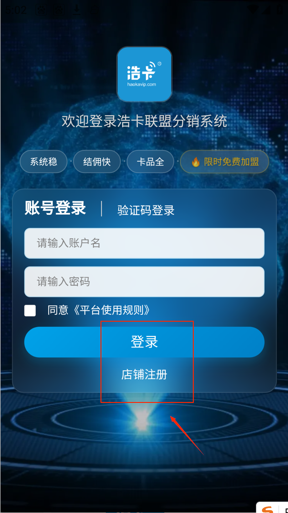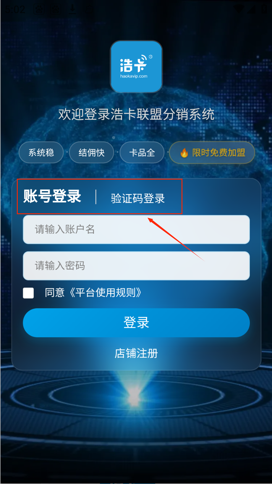 3、登录时可以选择账号或验证码方式,账号登录要输入账户名和密码,验证码登录则需要手机号和短信验证码,别忘记勾选同意规则哦。