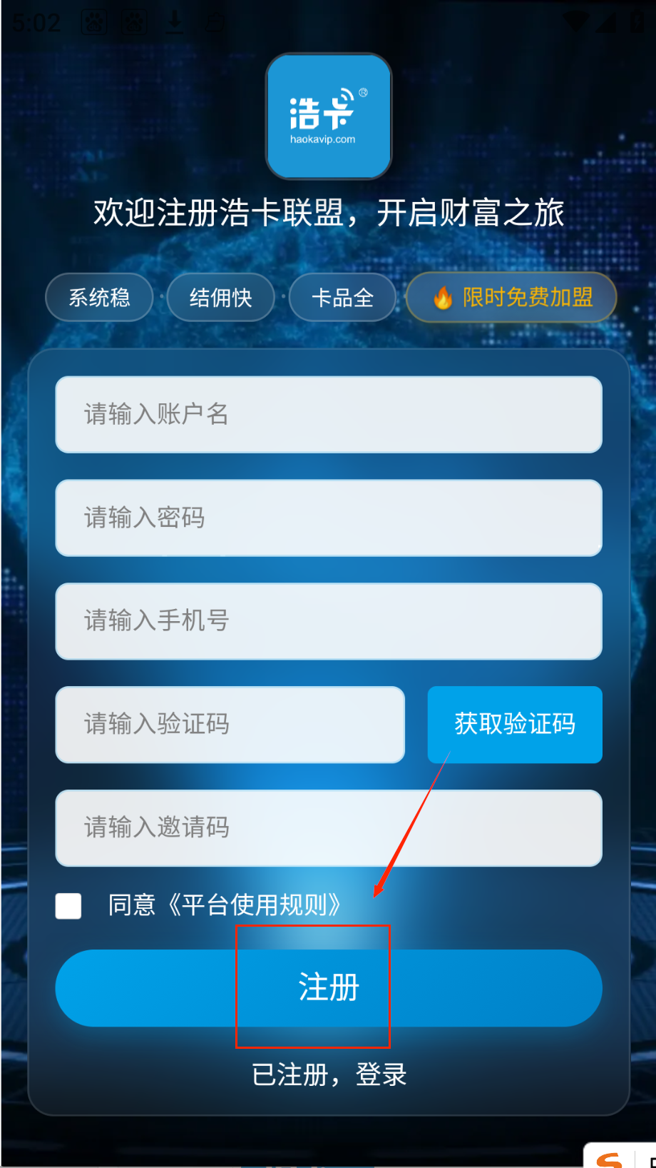 2、注册时要先想个账户名,再设置密码填写手机号,获取并输入验证码,有邀请码的话也要填上,最后勾选同意规则就能完成注册了。