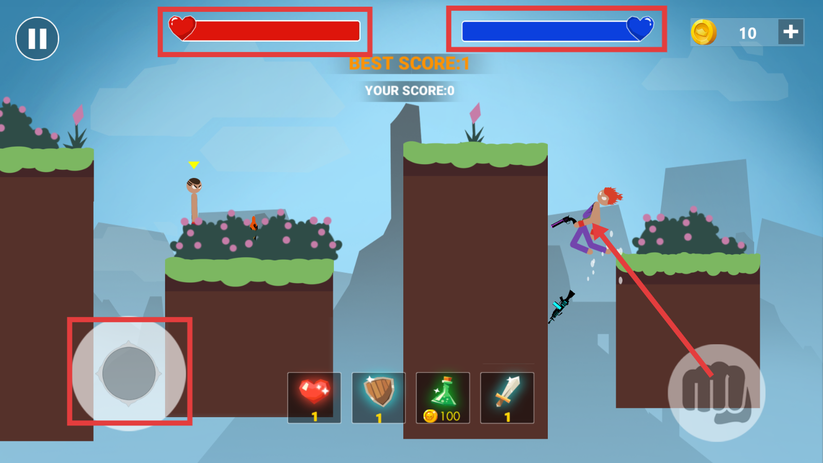2、左侧摇杆操控移动,右侧按钮执行攻击,留意顶部红-蓝血条,灵活调整战斗策略。