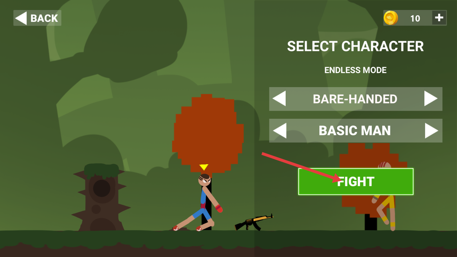 1、进入【SELECT-CHARACTER】界面,选定角色后点击绿色【FIGHT】按钮,开启无尽模式战斗。