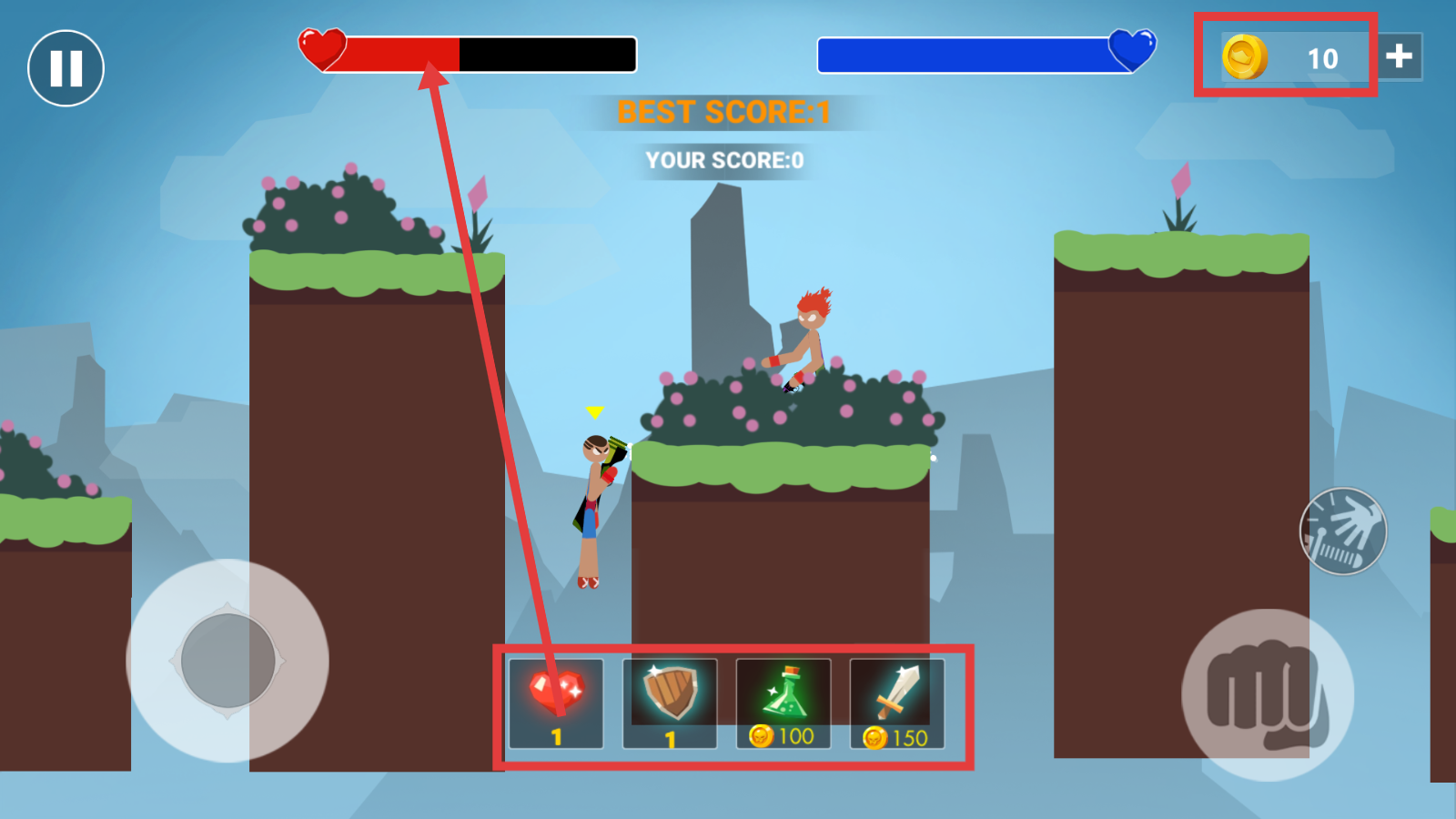 3、战斗中消耗【10】金币使用下方道具,恢复血量或强化战力,助力击败对手提分数。