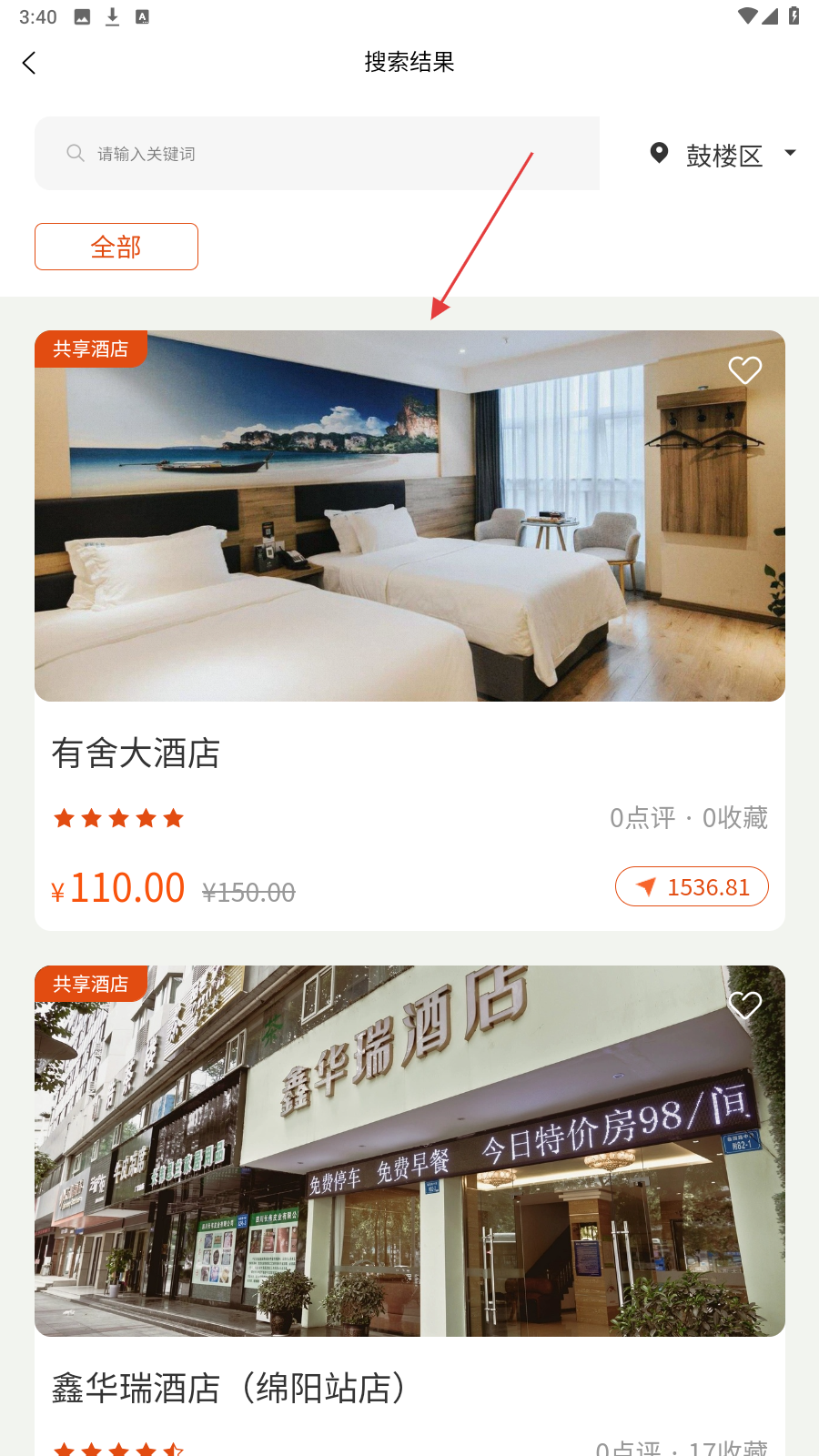 3、搜索结果页,选感兴趣酒店(如有舍大酒店),查看房型和价格。