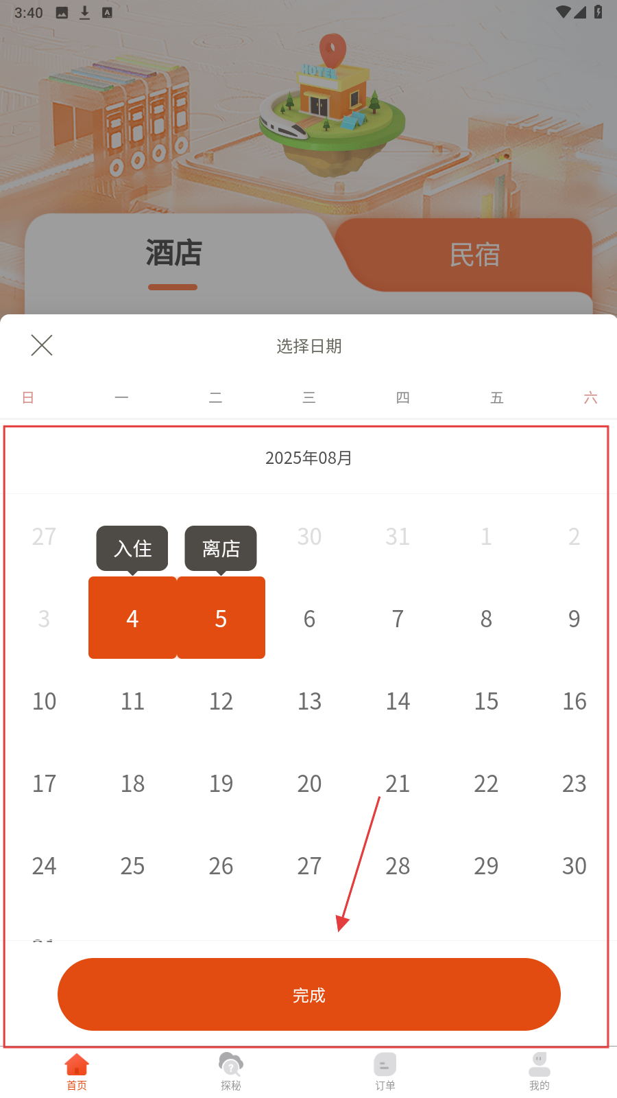 2、在日期选择页,确认入住4号、离店5号,点【完成】锁定日期。