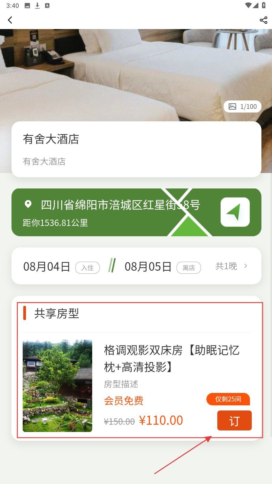 4、进入酒店详情,选【格调观影双床房】,点【订】完成预订。