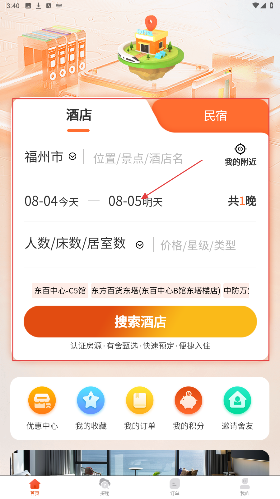 1、首页选【酒店】,设置福州市、入住离店日期,填人数等信息。