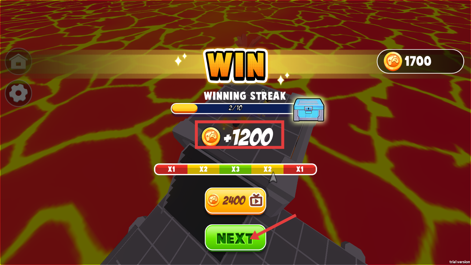 4、胜利后获得【 1200】金币奖励,点击【NEXT】按钮继续挑战,积累连胜提升奖励倍率。