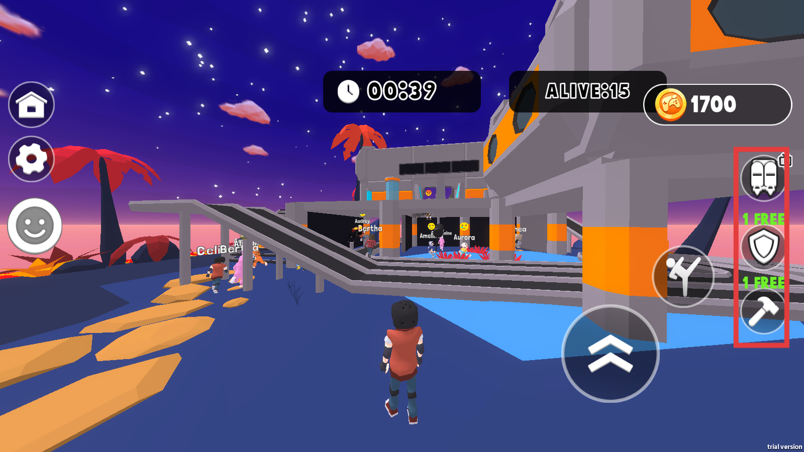 2、游戏中留意【ALIVE-15】存活人数,善用右侧免费技能道具,提升生存与战斗效率。