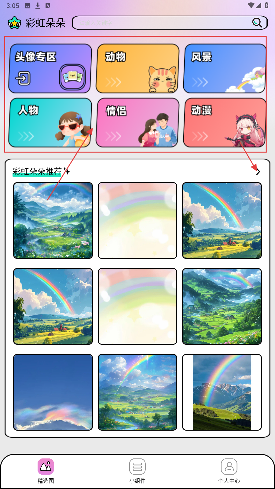 1、打开【彩虹朵朵】,选喜欢分类或者查看推荐壁纸,找心仪壁纸。